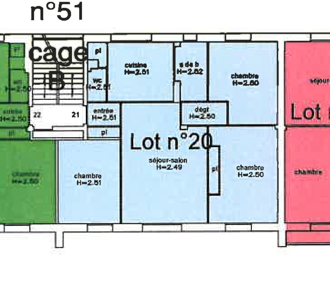 Au 53 Rue Alfred Seguin, Appartement T4 (lot 20), de 66.18m², au 2ème étage, comprenant un séjour, une cuisine, 3 chambres, une salle de bain, wc, une cave (lot 105).