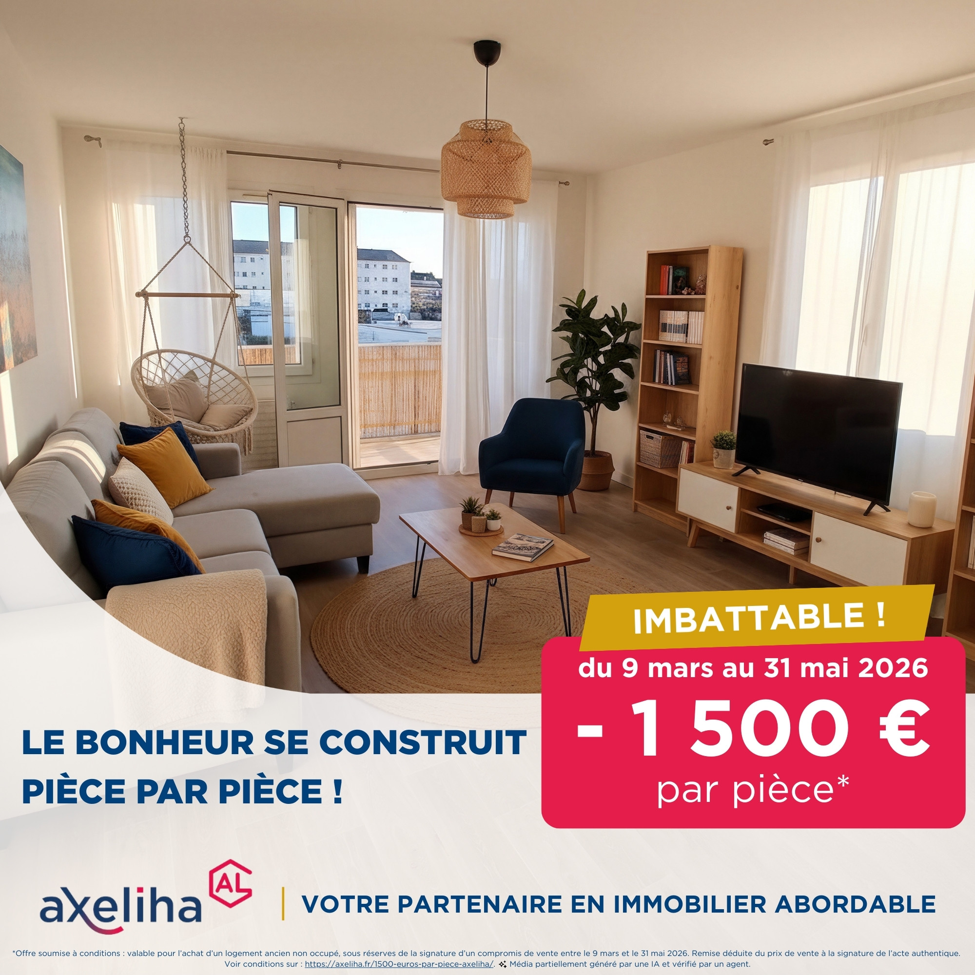 Cette offre commerciale se déroule du 9 mars au 31 mai 2026 inclus pour toute signature de compromis de vente ou contrat de réservation sur cette période, sans aucune dérogation supplémentaire. Elle n’est valable que sur les logements vacants et exclut les ventes de logements déjà occupés. Le montant de la remise est déduit du prix d’achat en fonction du nombre de pièces relatif à la typologie du logement acheté. Achat au prix affiché avec acceptation du client des conditions d’encadrement de loyers et de partage de la plus-value en cas de revente avant 5 ans conformément à l’article L.443-12-1 du CCH.