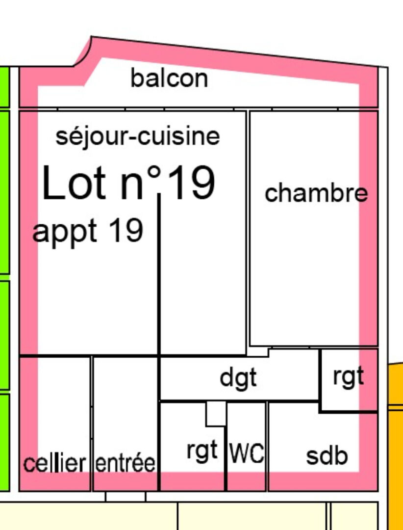 Au 4 rue du 14 juillet 1789 à Trélazé, appartement lumineux (lot 19) de 57,07m² au dernier étage sans ascenseur et comprenant entrée avec deux rangements, séjour, cuisine à aménager et équiper, balcon exposé au nord, dégagement avec placard, WC, salle de douche, une chambre. Chauffage collectif au gaz, DPE : D